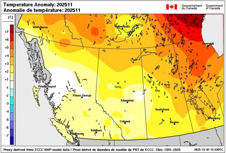 November was a very pleasant month with only a handful of days with below normal temperatures. Yorkton and Regina were at least three degrees above normal. (All maps and charts are courtesy of Environ...