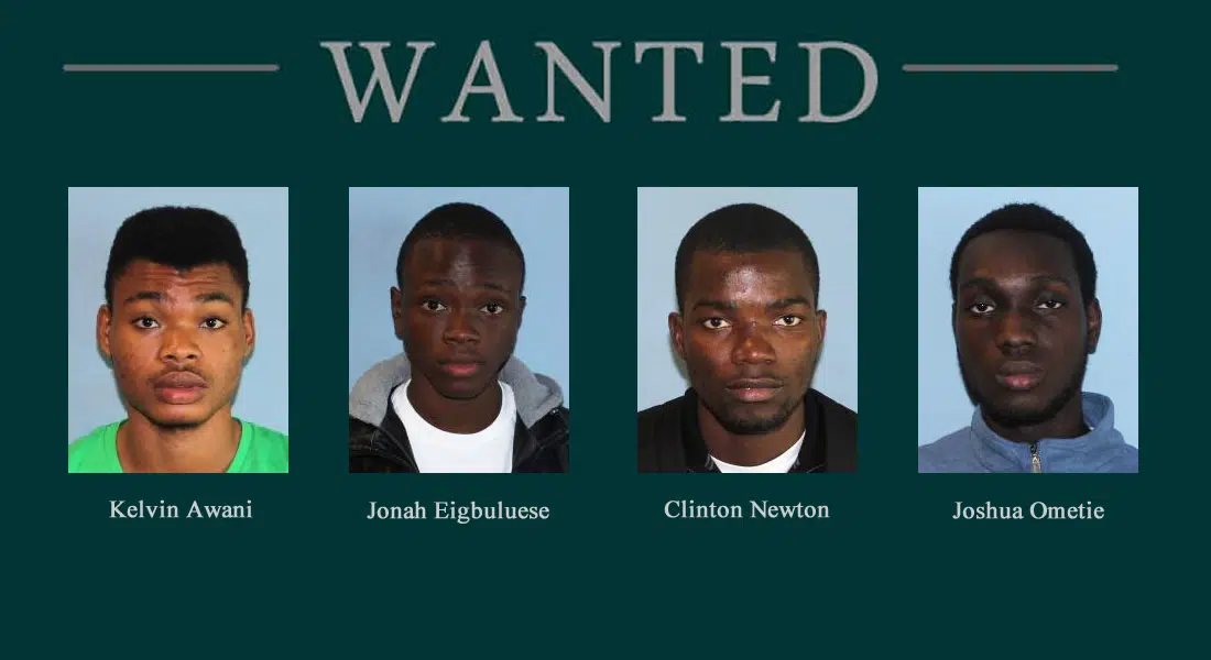 Police are looking for 4 men who could be anywhere in Canada – 24 year old Kelvin Awani, 25 year old Joshua Ometie, and two 27 year olds, Clinton Newton and Jonah Eigbuluese.