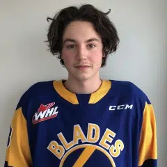 The Eastern Conference cellar-dwelling Bengals got goals from Logan Barlage and Oasiz Wiesblatt in the first five-and-a-half minutes for a 2-0 lead in front of 2,713 fans at SaskTel Centre. But, it was all Bridge City Bunch after that as eight players posted multi-point games and the Blue and Gold scored nine goals for the first time since a 9-3 victory in Calgary on October 14, 2019. It was also the first time the Blades had scored nine goals in a game on home ice since a 9-0 whitewashing of Regina on December 8, 2012. Rhett Rhinehart (pictured), Tristen Robins, Jayden Wiens and Kyren Gronick all had two goals and an assist while former Medicine Hat defenceman Ryan Nolan notched his first career W-H-L goal to close out the scoring. Forwards Noah Boyko and Trevor Wong each had three helpers while Kyle Crnkovic and blueliner Charlie Wright chipped in two assists each for the Blades who are on their first three-game winning streak since October. Saskatoon improved to 20-14-2 for the season, the eighth W-H-L team to register 20 wins for the season. The lop-sided win came with head coach Brennan Sonne in isolation at home while four defencemen were sidelined in the W-H-L’s COVID-19 protocol…captain Aidan De La Gorgendiere, Tanner Molendyk, Ben Saunderson and Marek Schneider. Rookie 16-year-old centre Misha Volotovskii dropped back to take shifts on defence as the Blades dressed four other defencemen and 13 forwards, including affiliate call-up Jordan Keller. The Bridge City Bunch dominated on special teams in handing the 7-25-4 Tigers their fourth straight loss and fifth consecutive setback on the road. The Blue and Gold were four-for-six on the power play, the sixth straight game in which the Blades have scored at least one man advantage goal, while adding two short-handed tallies. Rookie Ethan Chadwick stopped 28 shots as the Bengals out-shot Saskatoon 30-24. It was the 17-year-old Saskatoon product’s first career win at SaskTel Centre and first win since a 4-3 October 30 victory in Medicine Hat. Between a leg injury and sidelined by a case of COVID-19, Chadwick hadn’t started a game since November 14 and hadn’t made an appearance in goal for the Bridge City Bunch since November 27. The Blue and Gold don’t get long to savour the win as they host the C-H-L’s Number 1 ranked team, the Winnipeg ICE, Saturday at 7 o’clock at SaskTel Centre. The broadcast on CJWW begins at 6:30. Following is the official game summary courtesy the W-H-L as well as Les Lazaruk’s post-game show interviews with associate coach Ryan Marsh, Rhinehart and Chadwick…..