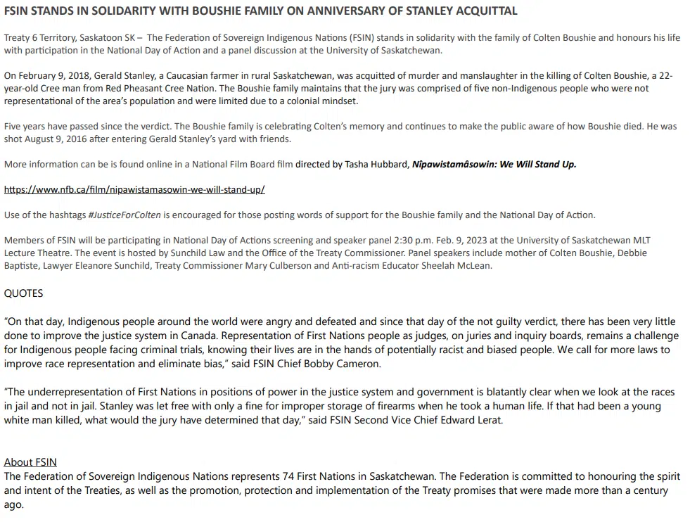 The Federation of Sovereign Indigenous Nations issued a news release in support of the Boushie family. The Office of the Treaty Commissioner also sponsored an event Thursday afternoon at the University of Saskatchewan. Colton’s mother, Debbie Baptiste and three other speakers participated in a panel discussion. The family maintains the Stanley jury with five non-indigenous people was not representational of the area’s population.