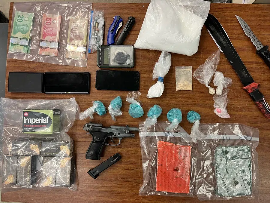 After tracking a stolen skid steer to a garage in Moose Jaw, Moose Jaw Police say they also located two suspects and a substantial amount of drugs, cash as well as an imitation firearm.