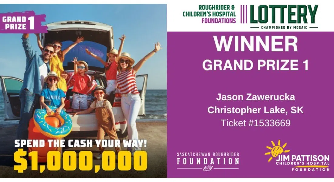 A Christopher Lake man has become Saskatchewan’s latest millionaire. The top grand prize winner of $1 million in the Roughrider & Children’s Hospital Foundations Lottery is Jason Zawerucka. He says he hadn’t bought any lottery tickets in a long time and just thought it was time to start again. He found the Roughrider & Children’s Hospital Foundations’ Lottery page and figured it would be a good thing to support.