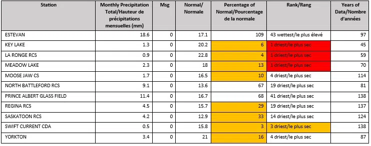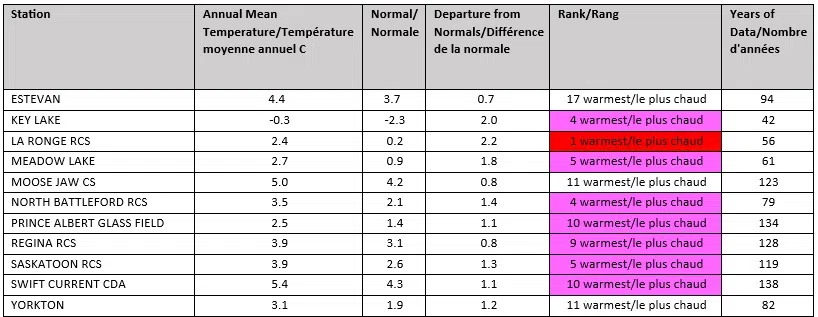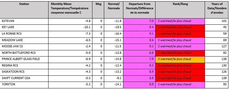 Environment and Climate Change Canada meteorologist Terri Lang compiles the monthly statistics from twelve cities and towns around the province. The monthly mean temperature was anywhere between 7.0 and 9.4 degrees above normal. Lang notes that 160 maximum temperature and 50 high minimum temperature records were set last month.