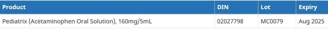 One lot of pediatrix acetaminophen oral solution for children has been recalled due to the potential risk of an overdose. Teva Canada is recalling the affected lot where there may be 185 milligrams per 5 millilitres of acedtaminophen rather than the approved and labelled 160 milligrams per 5 millilitres. Health Canada is monitoring the company’s recall. Return the product to your local pharmacy for proper disposal.