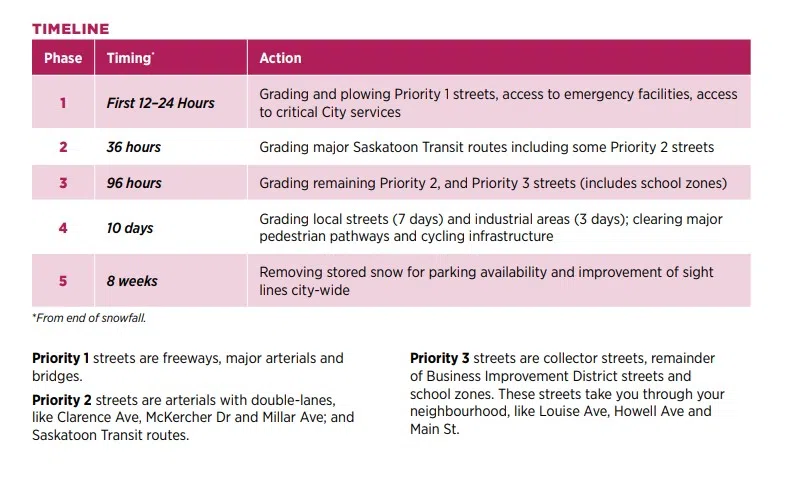 The Director of Saskatoon Roadways Goran Saric says priority streets will be graded by Thursday morning. At that point all local streets will be graded. After those are finished the city will move into industrial areas. Snow will be pushed to the side and will remain there until a decision is made regarding city wide snow removal. Snow will continue into Sunday evening and the City of Saskatoon says their priority is maintaining access to all emergency facilities as well as Circle Drive and other main arterials.