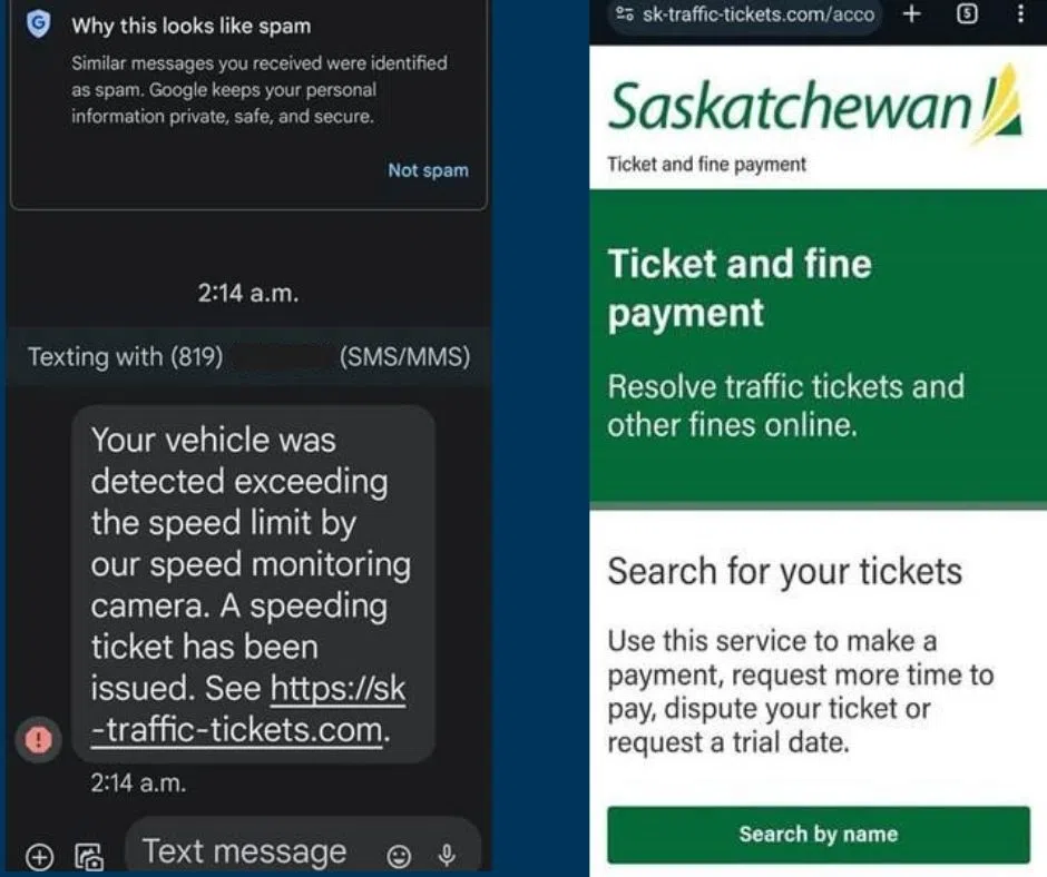 The Saskatoon Police Service has been made aware of a text scam circulating in the community. People are receiving texts claiming their vehicle was detecting speeding by a camera, and then it offers the chance to pay the ticket online. The Police Service advises to block the number and ignore the text. Do not click the link or make any payments to this website.