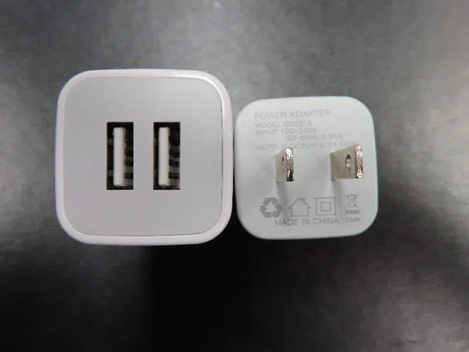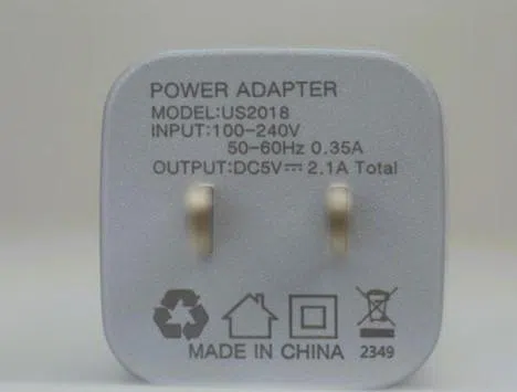 The affected products are a 2.1A/5V dual port USB cube power adapter in white with a grey stripe. The model number US2018 is found on the prong side of the adapter. The products were sold in a package of 5 or in package of 2 on Amazon.ca and can be identified by the Amazon Standard Identification Number (ASIN) B083LBZX1F and B082XPSDFL.