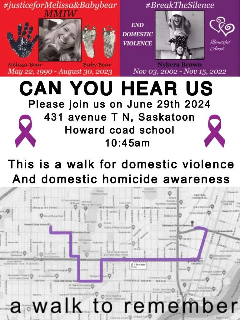 There is a Walk for Domestic Violence and Domestic Homicide Awareness Saturday morning. Everyone is welcome to join. It begins at Howard Coad School at 10:45 in the 400 block of Avenue T North and will end at the Saskatoon Police Service headquarters. Police Chief Cam McBride is expected to deliver remarks after the walk.