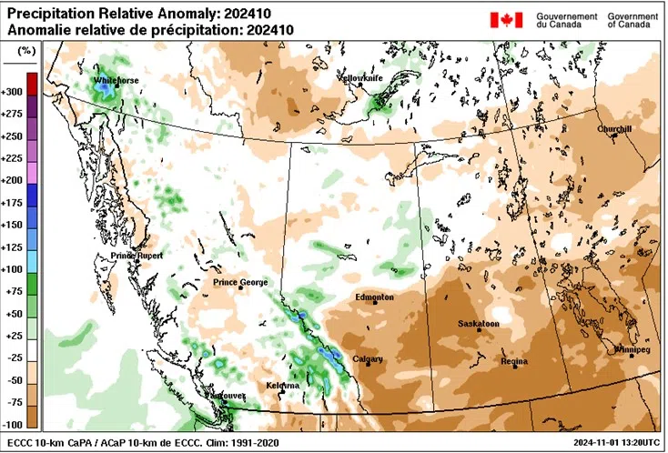 The lack of active weather meant it was very dry in October with most centres receiving less than one-third of normal precipitation. It was the second driest October on record in North Battleford which only had 1.1 millimetres of precipitation—or just seven percent of normal.