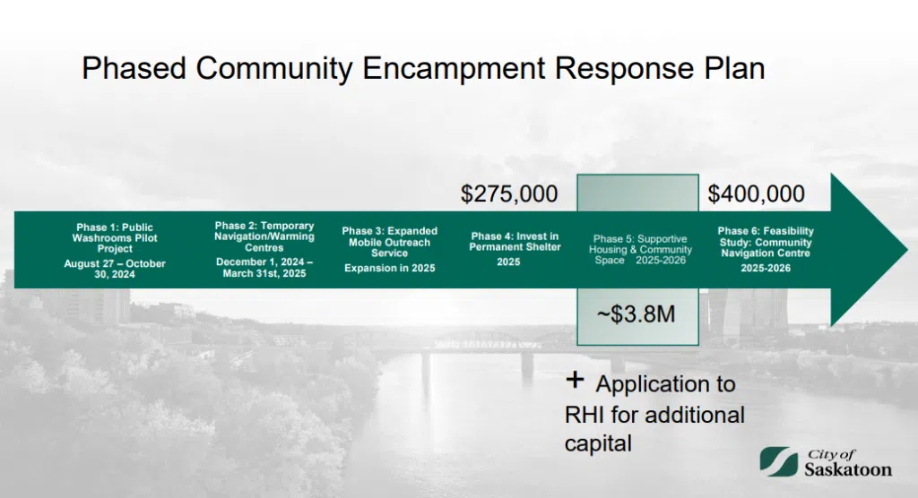 In October, the federal government told the city about a funding opportunity to improve homelessness. It would provide Saskatoon $4.48 million, but only if Saskatoon could match the funds and develop a Community Encampment Response Plan.
