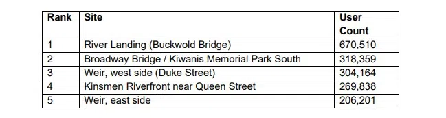 The Meewasin Valley Authority has trail counters at fixed locations through the river valley. Two types of counters collect the data every month, providing information on the direction of travel, time of day and whether it is a pedestrian or cyclist. These are the busiest five locations: