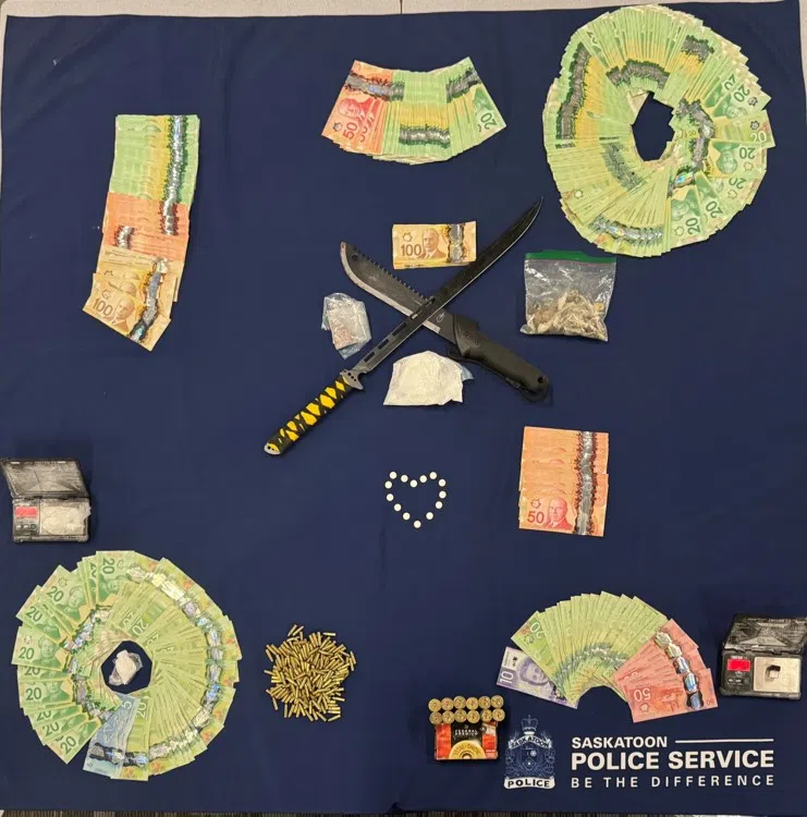 A Saskatoon Police Service news release says the Crime Reduction Team, with assistance from the Tactical Support Unit, conducted a traffic stop Thursday at about 2 p.m. in the 500 block of Kerr Road. A man and a woman, both 25 years old, were taken into custody without incident. Not long after, a search warrant was executed at a residence in the 100 block of Hedley Street and a 24-year-old man was arrested. All three individuals are facing 15 charges relating to drugs and possession of the proceeds of crime over five thousand dollars. Following is a list of seized items, which are pictured as well.