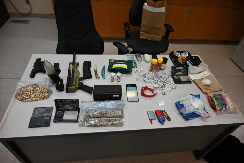 Among the items seized by police are a loaded handgun, a 3D-printed semi-automatic rifle, about 133 grams of crack cocaine, around 36 grams of magic mushrooms, 23 grams of illicit cannabis, and 50 grams of cannabis shatter.