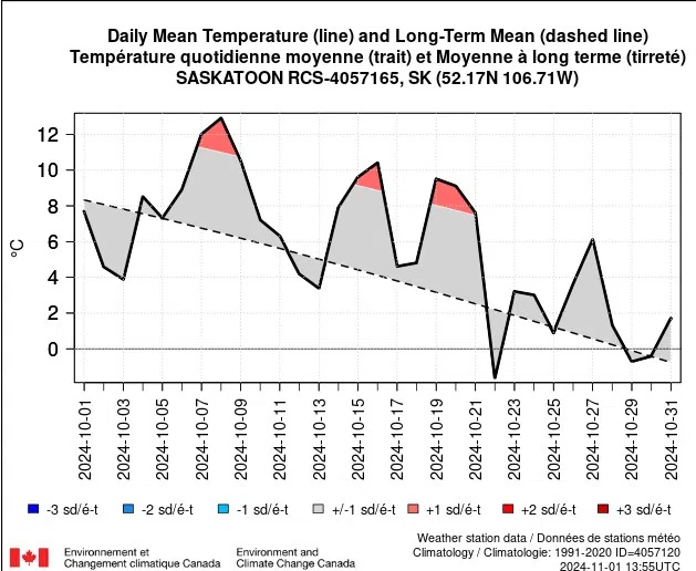 Saskatoon’s monthly mean was 1.7 degrees above normal making it the 38th warmest October in the last 126 years. There were only 8 days where the mean temperature was below normal. (The charts below were provided by Danielle Desjardin, Environment and Climate Change Canada)