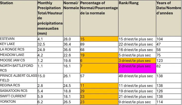 The lack of active weather meant it was very dry in October with most centres receiving less than one-third of normal precipitation. It was the second driest October on record in North Battleford which only had 1.1 millimetres of precipitation—or just seven percent of normal.