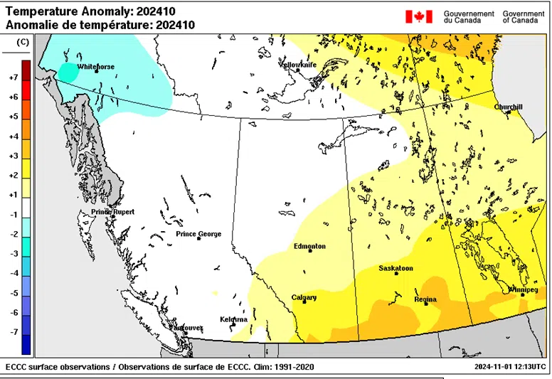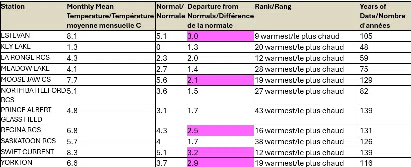 Environment Canada reports mean temperatures were between one and three degrees above normal in the southern half of the province and close to normal in the northern half.