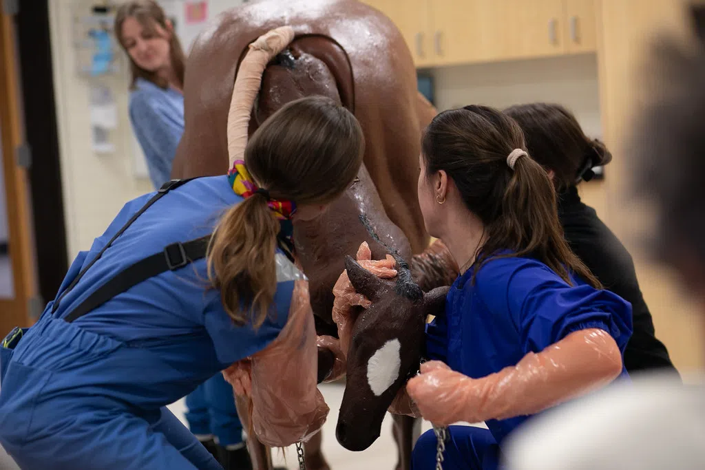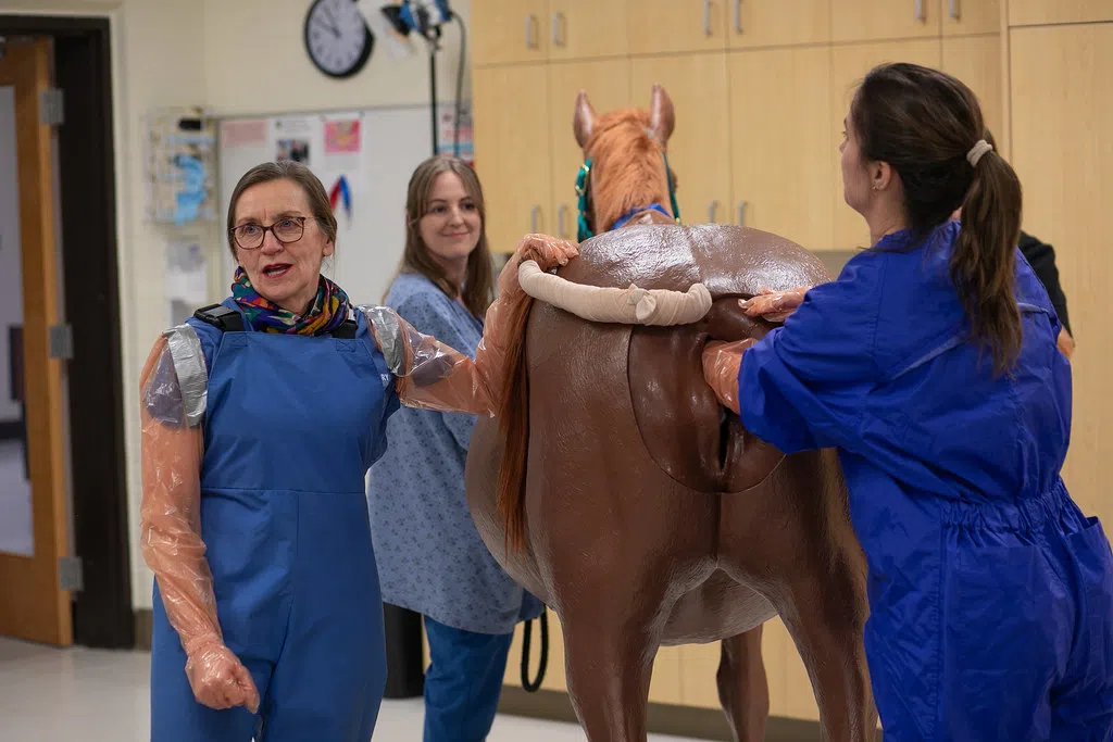 The two model horses are used by veterinary students to practice their foal delivery technique. WCVM Dean Dr. Gillian Muir calls the donated model horses “game changers” because they are great preparation for when it is time to do a live delivery.