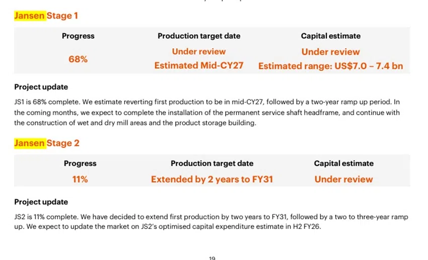 BHP pushes back timing for both Stage 1 and Stage 2 at Jansen