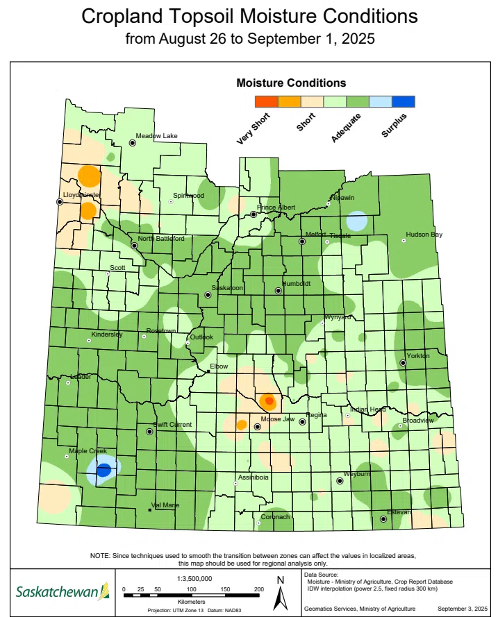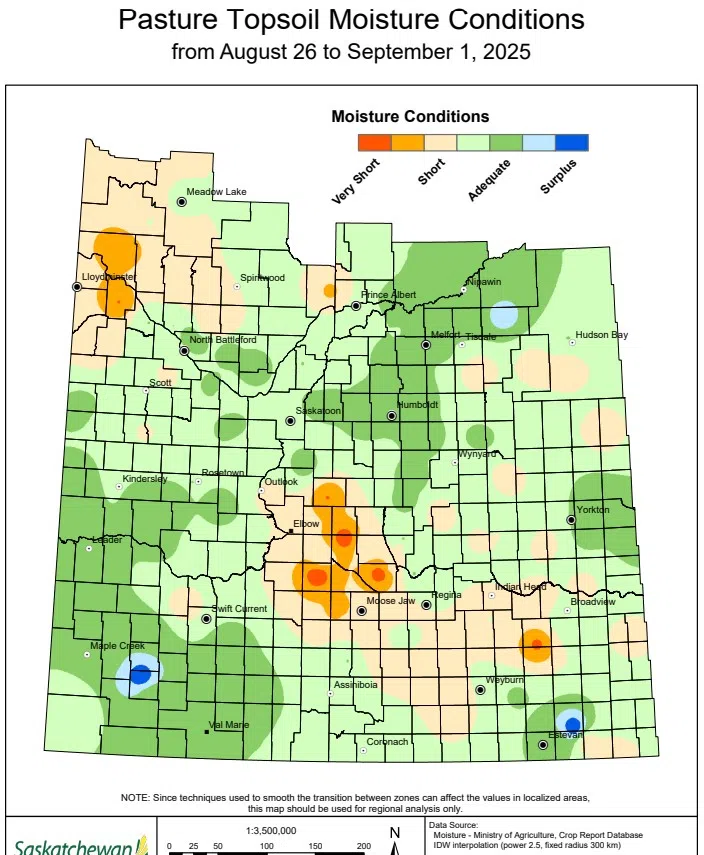 Provincially, cropland topsoil moisture is rated as two per cent surplus, 67 per cent adequate, 29 per cent short and two per cent very short. Pasture topsoil moisture is three per cent surplus, 51 per cent adequate, 37 per cent short and nine per cent very short.