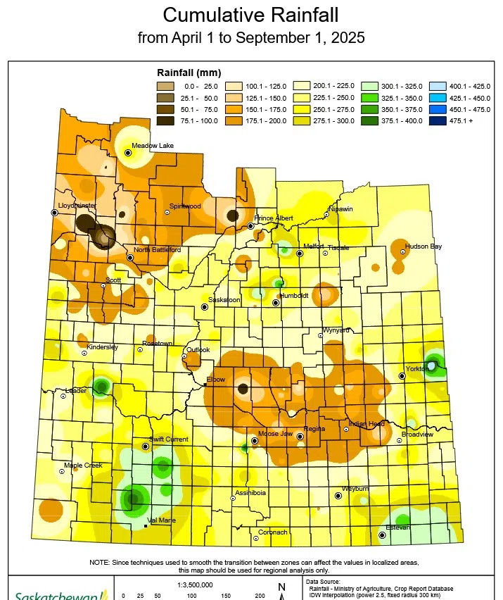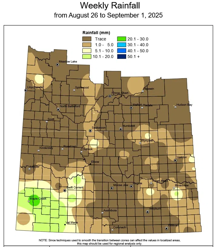 Most regions of the province were dry last week—with relatively small amounts of rain in the southwest. Piapot had the most at 25 millimetres with Shaunavon at 18 millimetres.
