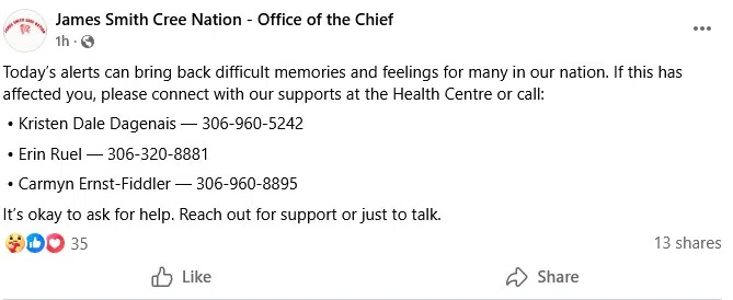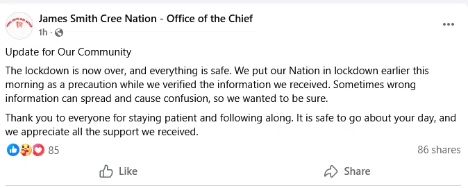The Saskatchewan RCMP say they did not issue an emergency alert or lockdown. Their investigation did not result in any charges and RCMP say they believe the matter to be concluded. A Facebook post from James Smith Cree Nation stated the lockdown was over and the community is safe.