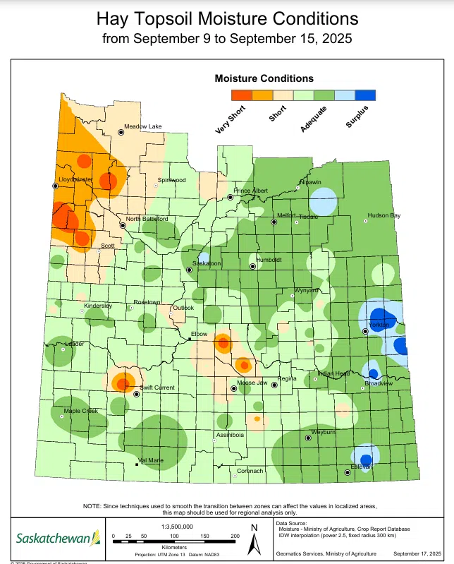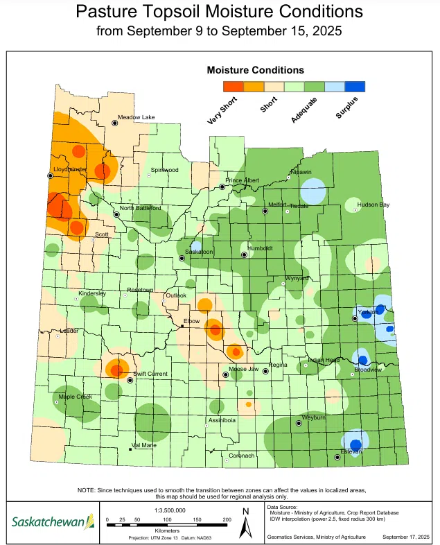 Speaking of varying rainfall amounts, some of the most significant precipitation fell in the Kipling area with 100 mm. The Lampman and Aberdeen areas saw almost just as much with 85 mm and 81 mm of precipitation, respectively. The rainfall brought topsoil moisture conditions for cropland to six per cent surplus, 66 per cent adequate, 22 per cent short and six per cent very short. For hayland, topsoil moisture is six per cent surplus, 58 per cent adequate, 25 per cent short and 11 per cent very short. Finally, pasture topsoil moisture is three per cent surplus, 54 per cent adequate, 29 per cent short and 14 per cent very short.