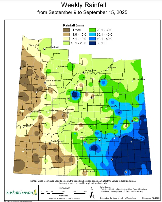 The five-year average is nearly three quarters complete at 73 per cent, while the 10-year average is 62 per cent. The Saskatchewan Agriculture weekly crop report attributes this season’s shortcoming to the impeding rainfall that many areas received between September 9th and 15th.