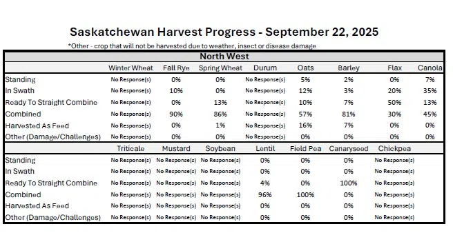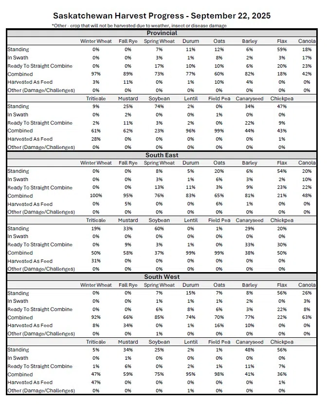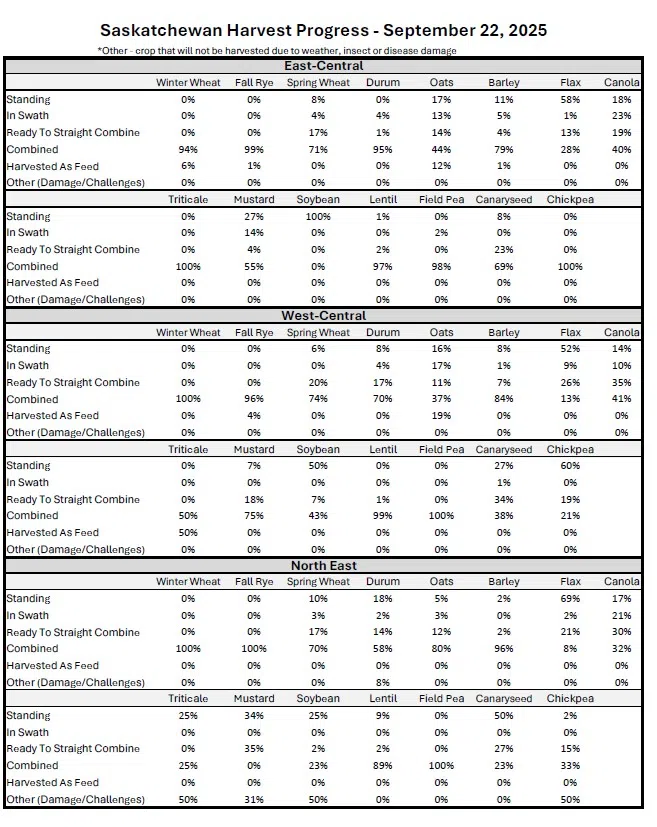 Harvest progress by crop has peas at 99 per cent combined, lentils (96 per cent), barley (86 per cent), durum (78 per cent), spring wheat (73 per cent), oats (70 per cent), canola (42 per cent), soybean (23 per cent) and flax (18 per cent).