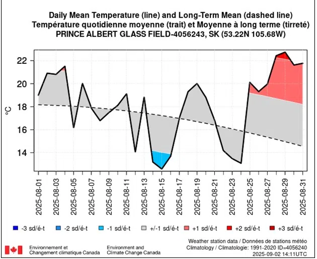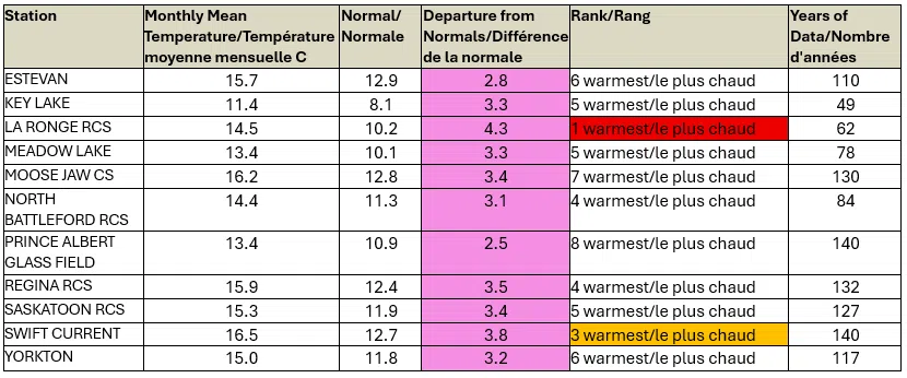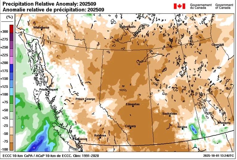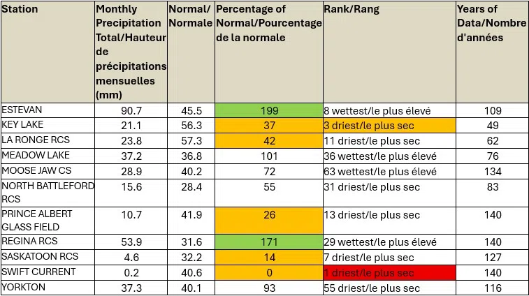 September was a very dry month for most centres, with the exception of Regina and Estevan. A series of slow-moving thunderstorms on the evening of September 12th contributed to nearly all of the precipitation totals.