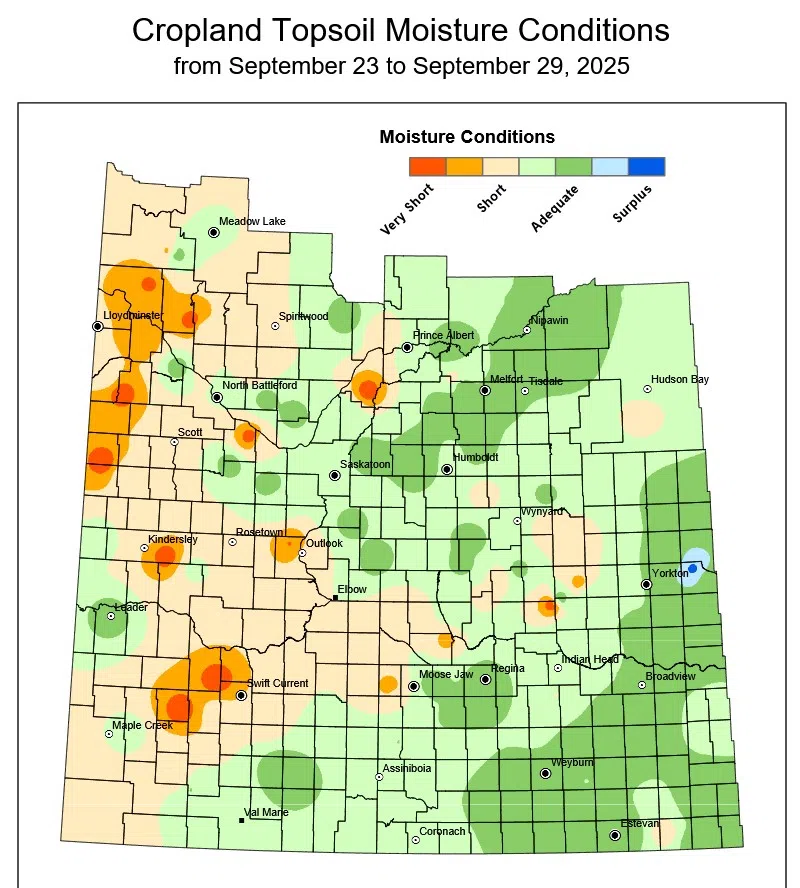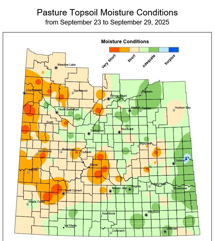 Topsoil moisture conditions fell again with provincial cropland ratings at one per cent surplus, 49 per cent adequate, 38 per cent short and 12 per cent very short. For pastures it’s 34 per cent adequate, 39 per cent short, and 26 per cent very short. Those numbers look pretty good when you compare them to the northwest. On cropland it’s 35 per cent adequate, 47 per cent short and 18 per cent very short. As for pasture topsoil moisture conditions in the northwest, it’s 27 per cent adequate, 36 per cent short and 37 per cent very short.