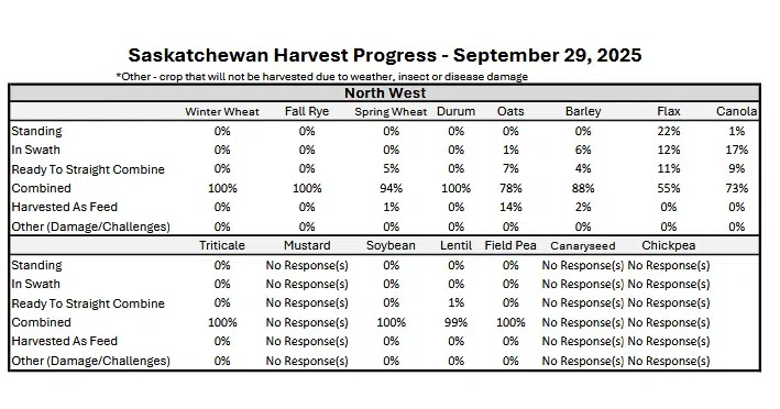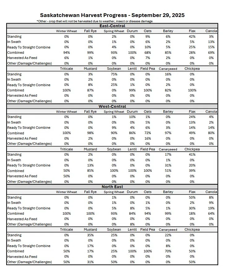 Breaking down the harvest by crop: peas are 99 per cent combined, lentils 98 per cent, barley 94 per cent, spring wheat 92 per cent, durum 91 per cent and oats 87 per cent combined.