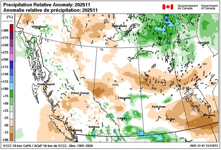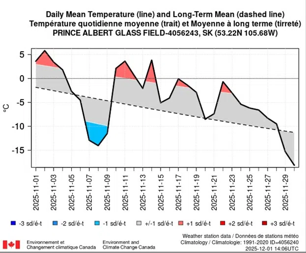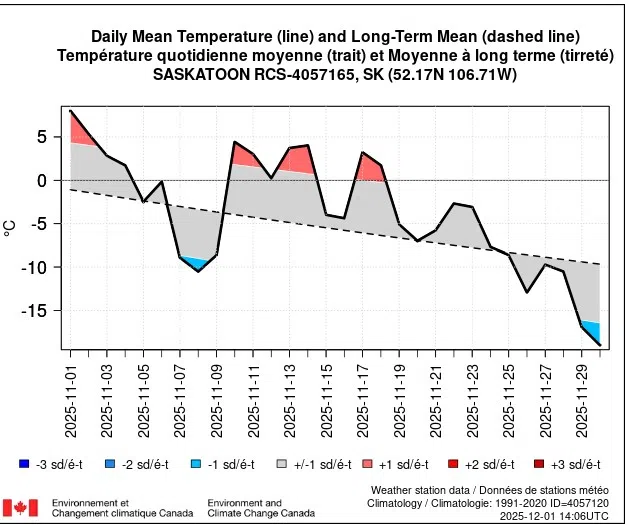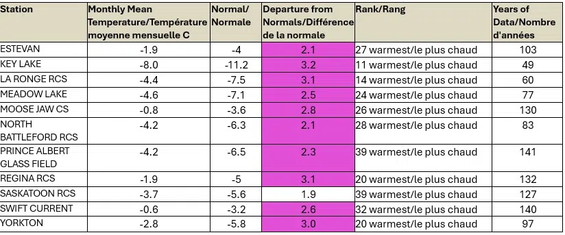 Yorkton and Regina were at least three degrees above normal. (All maps and charts are courtesy of Environment and Climate Change Canada)