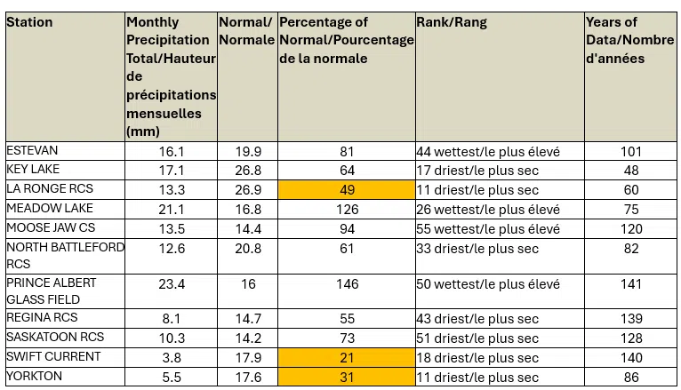 Two locations (Prince Albert and Meadow Lake) had above normal precipitation. All other centres were below normal or well below normal.