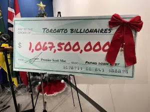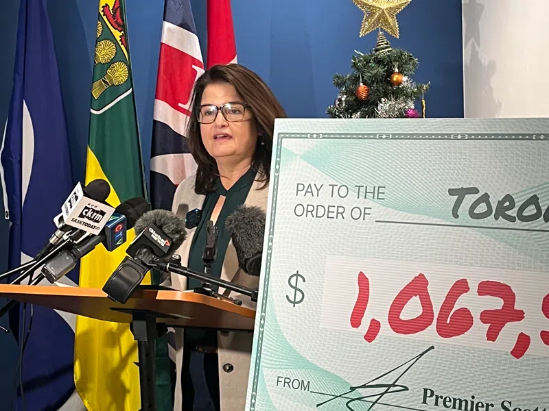 At a press conference, NDP Leader Carla Beck presented a novelty cheque worth over $1.067 billion, the amount of money she says that Saskatchewan taxpayers are paying to cover the interest of the province’s debt.