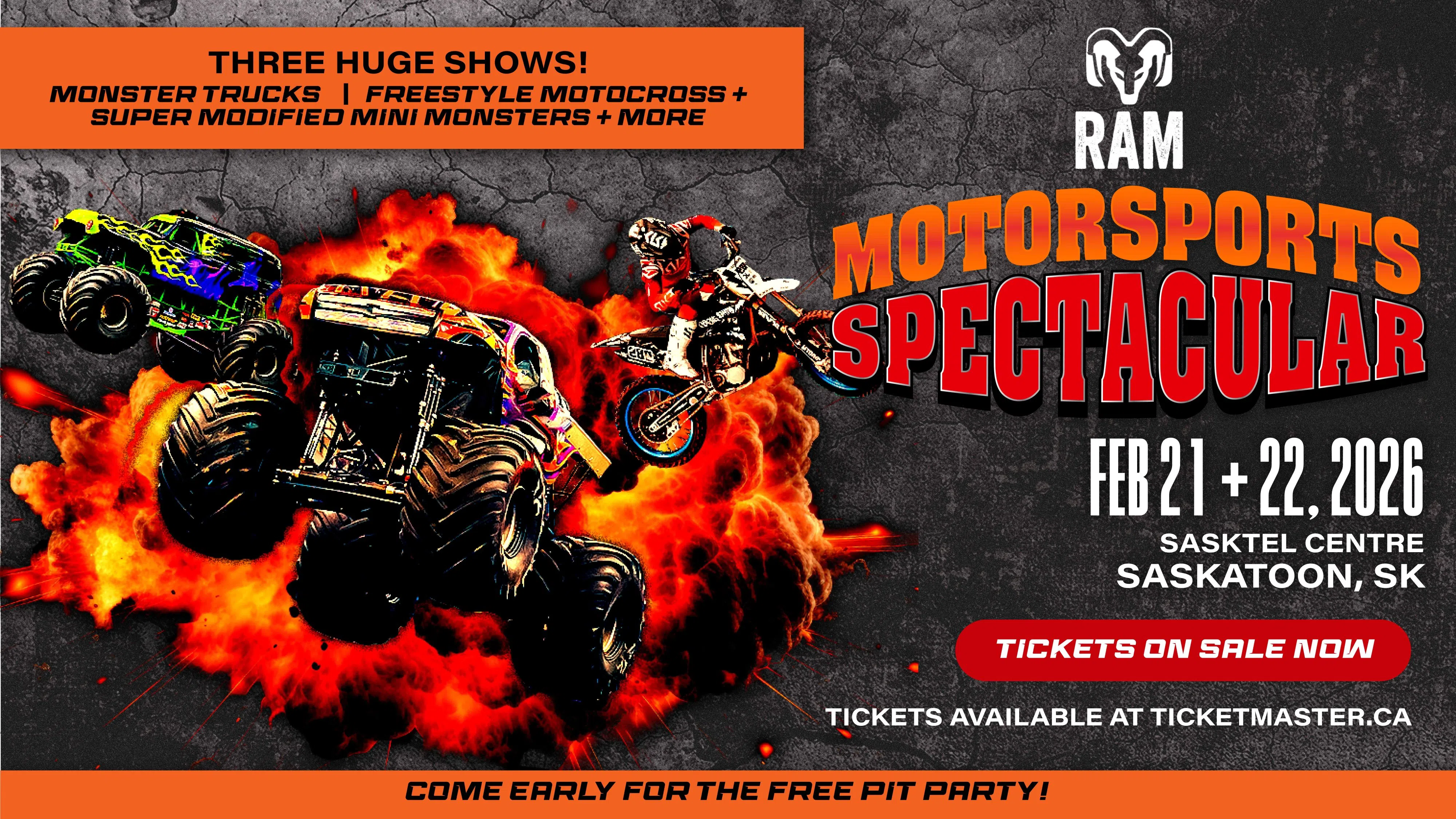 CJWW is excited to present the Ram Motorsports Spectacular at SaskTel Centre on February 21 & 22. 3 show times: February 21 @ 1pm & 7:30pm and February 22 @ 2pm. This action-packed event continues to thrill audiences with monster truck battles, freestyle motocross stunts, and family-friendly entertainment. Featuring iconic trucks like Rockstar, California Kid, and Spitfire, plus the return of the crowd-favourite Mini Monster Trucks, this edge-of-your-seat spectacle is a must-see for fans of all ages.